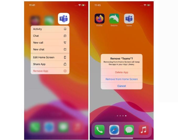 روی اپلیکیشنی که قصد مخفی کردن آن را دارید، با انگشت فشار دهید تا منویی ظاهر شود. در این منو، گزینههایی وجود دارد که محتوای آن به نوع اپلیکیشن انتخابی بستگی دارد. برای مثال، اگر مایکروسافت تیمز را انتخاب کرده باشید، این منو گزینههای برقراری تماس جدید و یا شروع یک چت را نشان میدهد. اما در همه موارد، یک گزینه (با رنگ قرمز) برای حذف اپلیکیشن وجود دارد که باید روی آن تپ کنید.