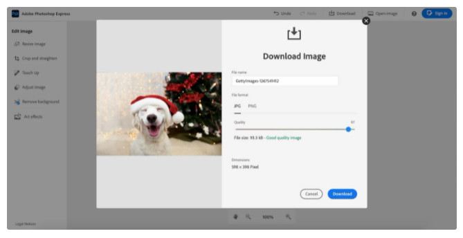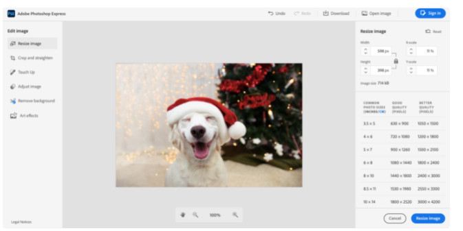 Adobe Photoshop Express یک ابزار ویرایش عکس رایگان است که به شما امکان می دهد هر تصویر را با چند کلیک تغییر اندازه داده فشرده کنید و برش دهید. می توانید یک عکس را برای فیسبوک ، یک تصویر نمایه LinkedIn و بنر توییتر را تغییر اندازه دهید. می توانید اندازه تصاویر را به صورت رایگان تغییر دهید، اما برای بارگیری آنها باید حساب کاربری ایجاد کنید.