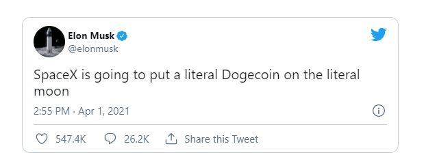 زمانی که ایلان ماسک روز ۱۲ فروردین همزمان با اول آوریل در یک توییت از فرستادن دوج کوین به ماه خبر داد، بسیاری تصور میکردند این موضوع دروغ اول آوریل است. اما امروز و با انتشار خبر جدید، ظاهرا ایلان ماسک شوخی نمیکرده و واقعا قصد دارد دوج کوین را به ماه بفرستد.