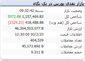 این در حالی است که شاخص کل با معیار هم وزن ۲۳۲۹ واحد کاهش یافت و رقم ۴۱۸ هزار و ۴۸۸ واحد را ثبت کرد.