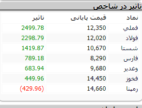 ملی صنایع مس ایران، فولاد مبارکه اصفهان، سرمایه گذاری تامین اجتماعی، صنایع پتروشیمی خلیج فارس، سرمایه گذاری غدیر، فولاد خوزستان نسبت به سایر نمادها بیشترین تاثیر مثبت و در مقابل گروه مپنا نسبت به سایر نمادها بیشترین تاثیر منفی را روی بورس گذاشتند.