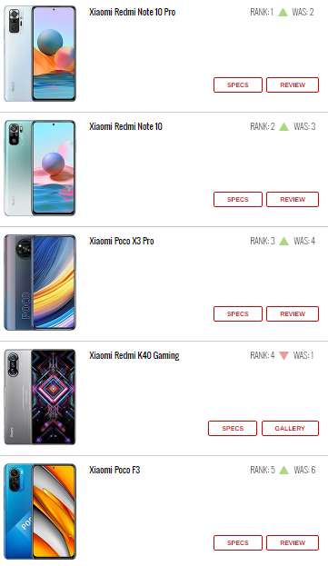 به گزارش موبوایران، شرکت شیائومی درست مثل چند هفته اخیر، باز هم محبوب‌ترین گوشی ساز دنیا است، چون محبوب‌ترین و پرطرفدارترین گوشی‌های هفته همگی ساخت این شرکت چینی هستند. در جدول پرطرفدارترین گوشی‌های این هفته، به ترتیب Redmi Note ۱۰ Pro، ردمی نوت ۱۰ و Poco X۳ Pro (همگی از شیائومی) بر روی جایگاه رفته اند و هر کدام با یک پله صعود نسبت به جایگاه هفته قبلشان، در رده اول تا سوم ایستاده اند.