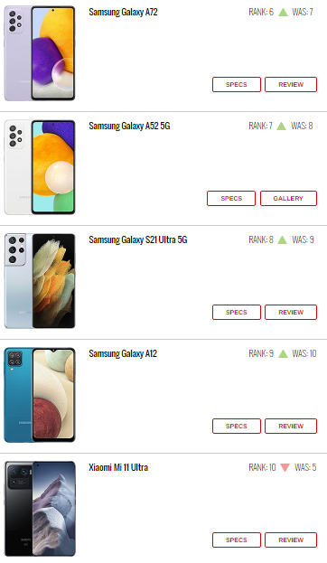 سامسونگ گلکسی A۷۲ و Galaxy A۵۲ ۵G هم با یک پله صعود نسبت به قبل، در رده‌های ششم و هفتم جدول ایستاده اند. اما نکته عجیب حضور گوشی هوشمند گلکسی S۲۱ Ultra ۵G شرکت سامسونگ در رده هشتم جدول پرطرفدارترین گوشی‌ها است، چون انتظار می‌رفت این گوشی با امکاناتی که دارد رتبه بهتری داشته باشد، البته باید دید هفته بعد این گوشی در رقابت با رقبا چه خواهد کرد.