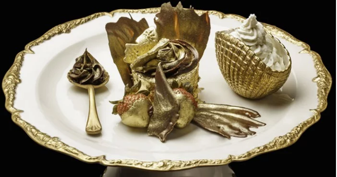 البته در ساخت آن‌ها از شکر، کره و شیر نیز استفاده شده است، اما ورقه‌های طلای خوراکی ۲۳ عیار سبب شده تا قیمت این بشقاب تا ۹۷۲ دلار ارزش گذاری شود.