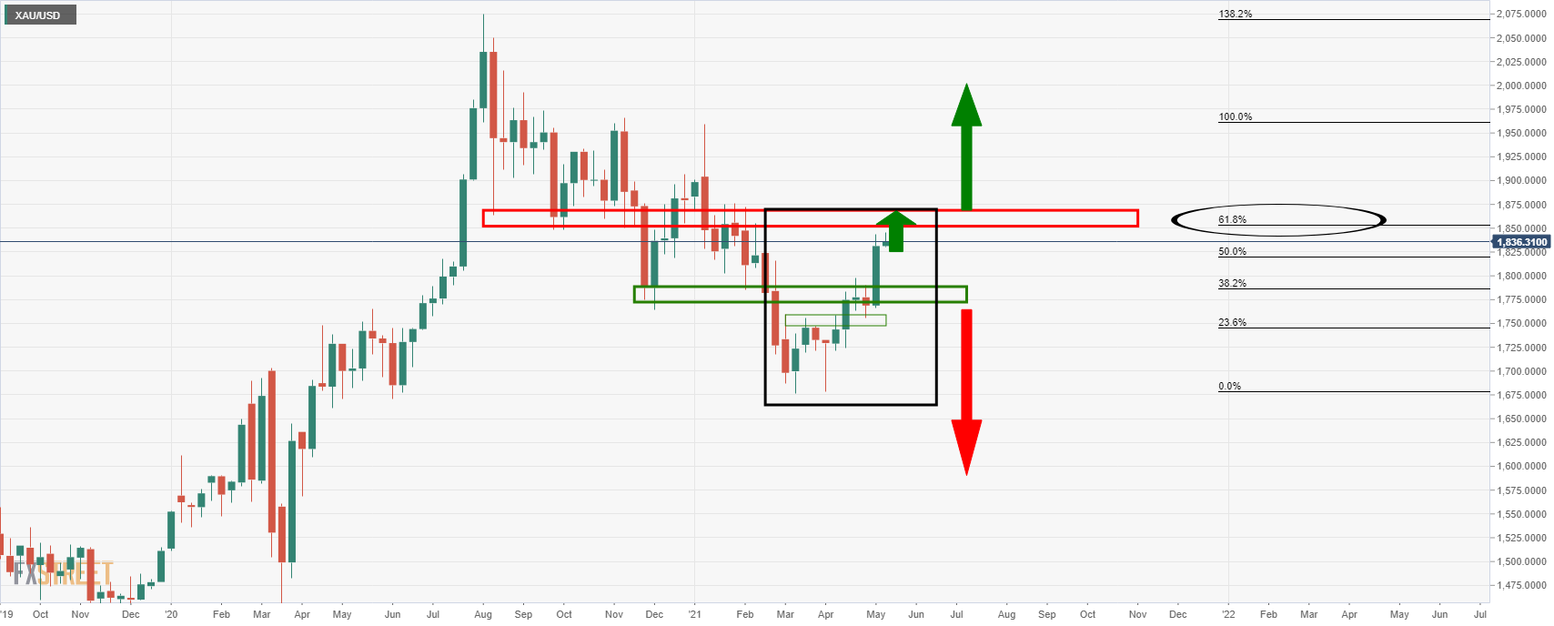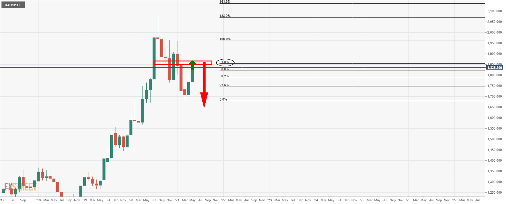 اگر به نمودار ماهانه (نمودار بالا) قیمت طلا نگاهی بیاندازیم متوجه می شویم که طلا پس از تجربه حرکت نزولی قبلی، هم اکنون شرایط خوبی برای افزایش قیمت و صعود به سمت مقاومت روانی در 1850 دلار را دارد.