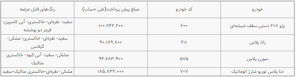 به گزارش سایت طلا، پژو ۲۰۷ دستی سقف شیشه‌ای، رانا پلاس، سورن‌پلاس و دنا پلاس توربوشارژ اتوماتیک، محصولات عرضه شده در طرح فروش‌ویژه ایران خودرو به مناسبت عید سعید فطر است.