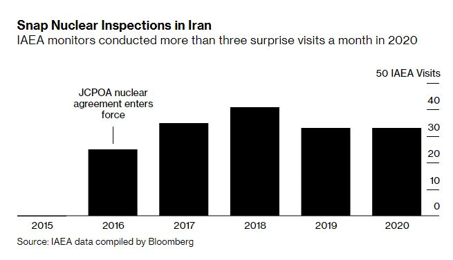 خبرگزاری بلومبرگ مدعی شد که بازرسان آژانس بینالمللی انرژی اتمی در سال 2020 در هر ماه، حدود سه بازدید سرزده از تاسیسات اتمی ایران داشتهاند.