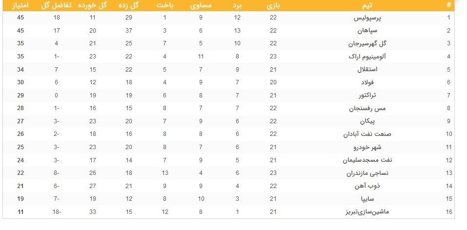 در مهمترین بازی هفته هم پرسپولیس از سد استقلال گذشت تا با 45 امتیاز و تفاضل گل بهتر نسبت به سپاهان، به صدر جدول لیگ برتر بازگردد. استقلال نیز که دو دیدار معوقه دارد، به رتبه پنجم جدول سقوط کرد و حالا 11 امتیاز با دو صدرنشین جدول فاصله دارد. تراکتور نیز مقابل صنعت نفت متوقف شد تا دو تیم بهترتیب در ردههای هفتم و دهم جدول بایستند.