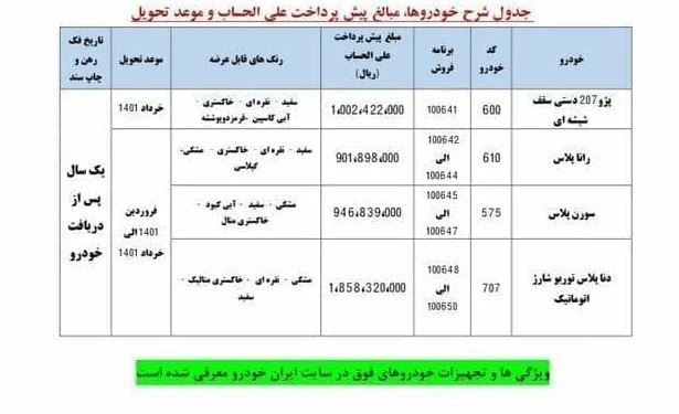 به گزارش سایت طلا، پژو ۲۰۷ دستی سقف شیشهای، رانا پلاس، سورنپلاس و دنا پلاس توربوشارژ اتوماتیک، محصولات عرضه شده در طرح فروشویژه ایران خودرو است.