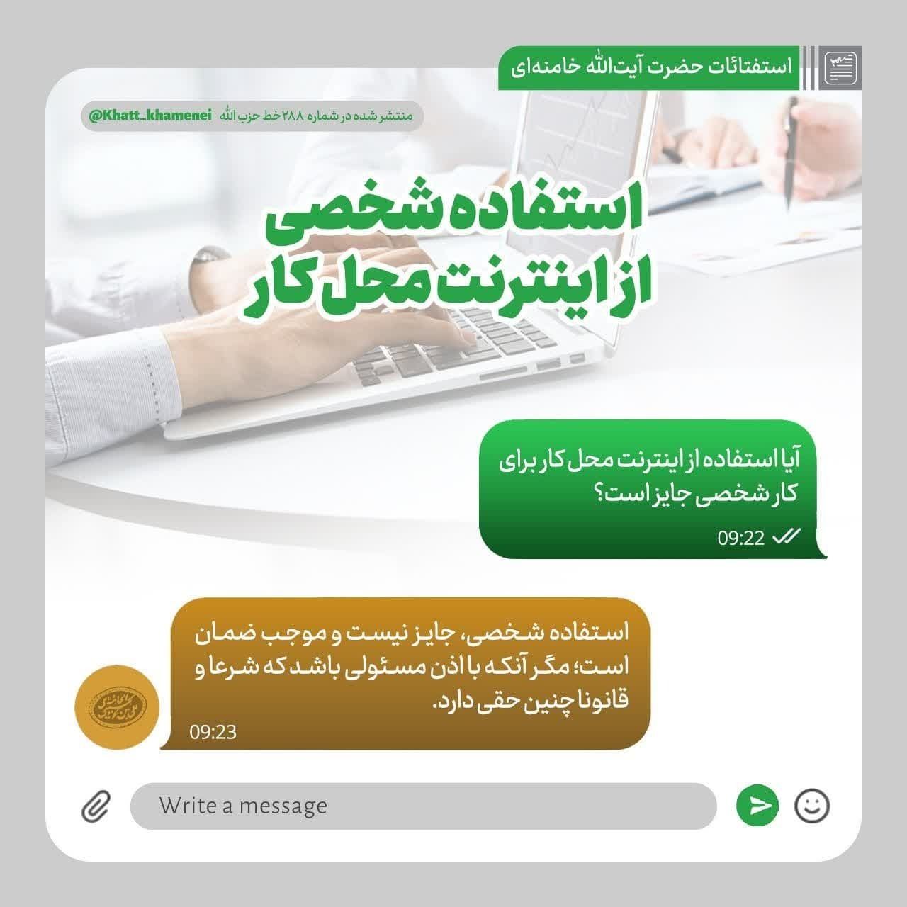 رهبر معظم انقلاب که یکی از مراجع عظام و عالی قدر جهان اسلام هستند، درباره موضوع استفاده از اینترنت محل کار توسط کارمندان و در پاسخ به اینکه استفاده از اینترنت محل کار برای کار شخصی جایز است یا خیر، فرمودند: