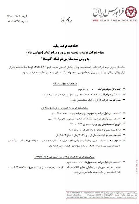 آگهی عرضه اولیه سهام شرکت «تولید و توسعه سرب و روی ایرانیان» با نماد «فتوسا» منتشر شده است که مطابق آن روز چهارشنبه (۲۹ اردیبهشت ماه) سهام این شرکت به شیوه ثبت سفارش در فرابورس عرضه خواهد شد.