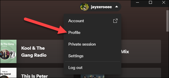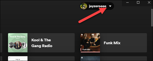 ابتدا برنامه Spotify را در رایانه Windows ، Mac یا Linux یا در مرورگر دسکتاپ Web Player باز کنید. از آنجا، روی پیکان رو به پایین در کنار نام کاربری خود در گوشه بالا سمت راست کلیک کنید.