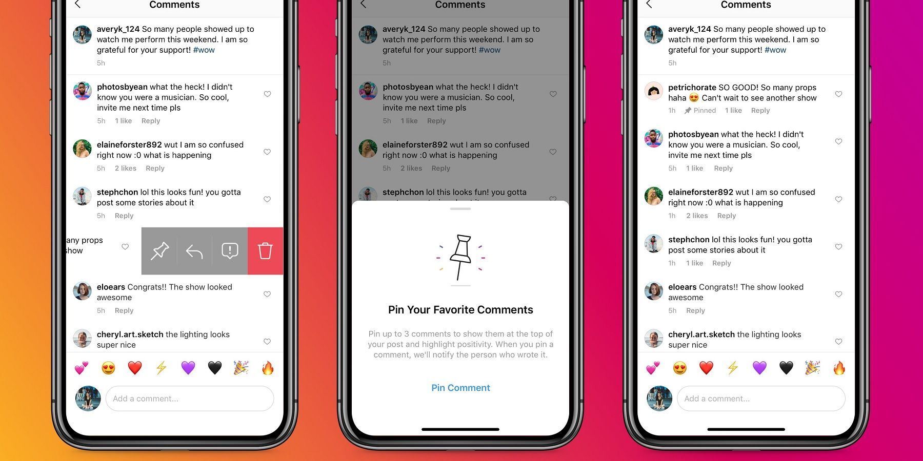 اینستاگرام به کاربران اجازه میدهد تا نظرات را در بالای یک پست سنجاق کنند. سه نظر برتر را میتوان پین کرد، با این ایده که واکنشهای مثبت به محتوای شما را برجسته کند.