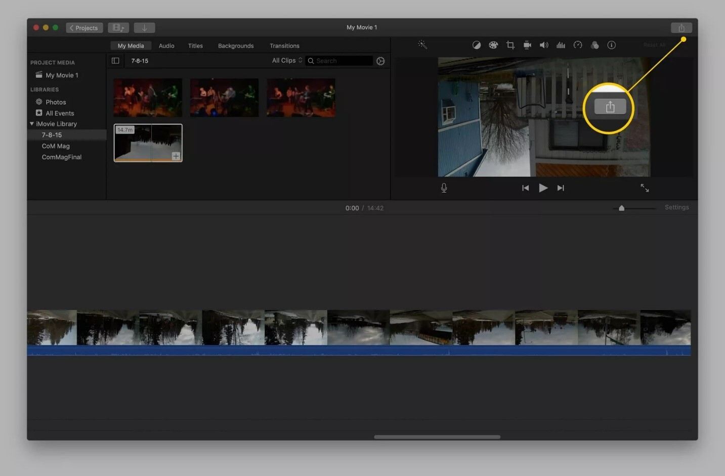 نسخه macOS iMovie تفاوتهایی با نسخه iOS دارد. در این نسخه پس از اتمام ویرایش ویدئو، دکمه اشتراک را در گوشه سمت راست بالای صفحه iMovie انتخاب کنید.