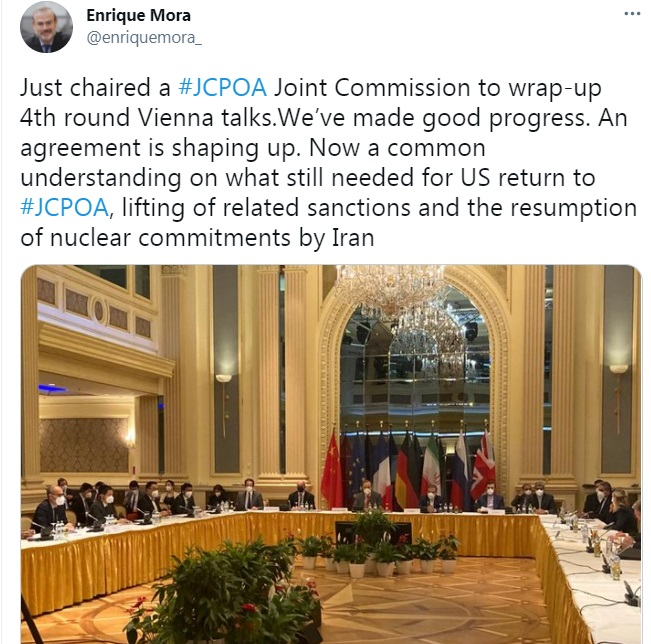 او همچنین در توییتی نوشت: ریاست نشست کمیسیون مشترک برجام برای جمع بندی دور چهارم گفت‌وگوهای وین را برعهده داشتم. پیشرفت خوبی داشته‌ایم. توافق در حال شکل گیری است.