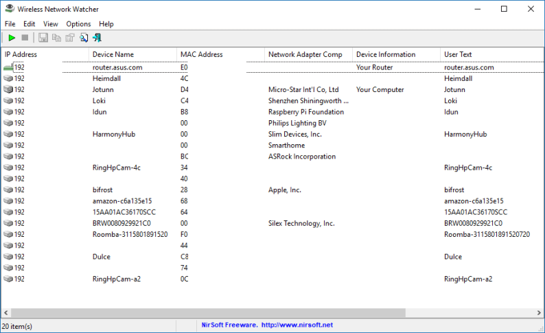 کاربران سیستمعامل ویندوز میتوانند از یک برنامه رایگان و قابل حمل به نام Wireless Network Watcher استفاده کنند. این اپلیکیشن لیستی از تمامی دستگاههایی را که در حال حاضر به شبکه شما متصل هستند را در اختیارتان قرار میدهد، بنابراین میتوانید دستگاههای مربوط به خودتان را تشخیص دهید.