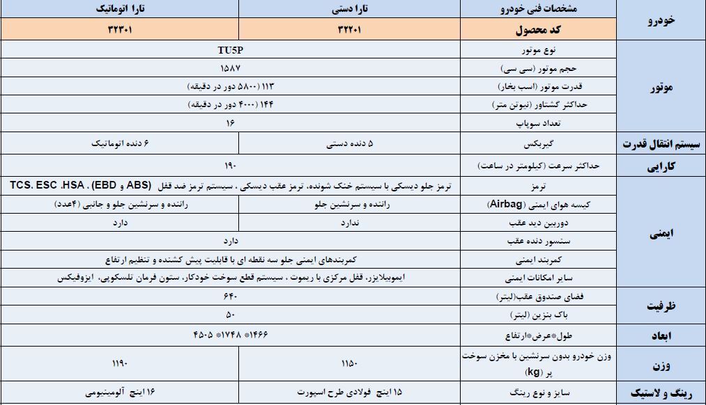 جدول مقایسه ای مشخصات فنی و سطح تجهیزات خودروهای خانواده تارا