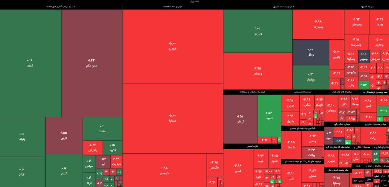 بیش از نصف معاملات امروز مربوط به صندوقهای سرمایهگذاری ETF است. صندوقهای درآمد ثابت کمند، امین یکم، کیان، پارند، افران و اعتماد امروز پرمعاملهترین نمادها بودند و هر کدام آنها به اندازه یک گروه بورسی سرمایه جذب کردند. دارا یکم امروز سقوط هفت درصدی و پالایش سقوط شش درصدی را پشت سر گذاشتند تا بدترین عملکرد روزانه در کارنامهشان ثبت شود. در بین بانکها و موسسات اعتباری مقاومت حقوقیهای وپاسار، وملل و وپارس جواب داد و این سه نماد از کاهش قیمت سهام نجات پیدا کردند. دیگران از جمله وبصادر، وتجارت و وپست پنج درصد ارزش خود را در صف فروش از دست دادند. فلزات اساسی، خودرو و ساخت قطعات، محصولات شیمیایی، مواد و محصولات دارویی، شرکتهای چند رشتهای صعنتی، سرمایهگذاریها، فرآوردههای نفتی، استخراج کانههای فلزی، عرضه برق و گاز، خرده فروشی، محصولات غذایی، حمل و نقل و خدمات فنی و مهندسی همگی دچار صف فروش بودند. شبصیر از شیمیاییها، بپاس و ما از بیمهها، وتوس و ثامید از انبوهسازی، واعتبار و معیار از سرمایهگذاریها، ساوه از سیمان و تنوین از نهادهای مالی تنها نمادهای سبز در نقشه بازار امروز بودند.