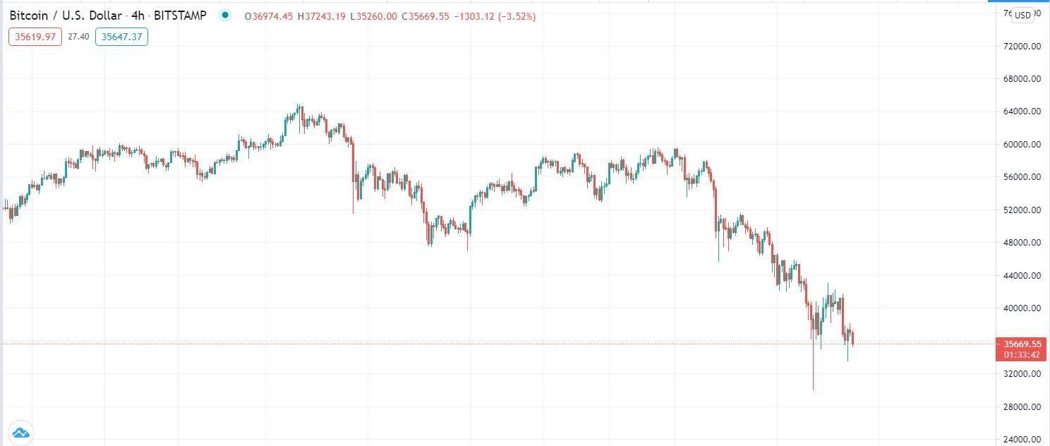 37 روز پس از پست از اوج تاریخی خود حالا تقریباً بیت کوین 50 درصد از ارزش خود را از دست داده است و پس از سقوط تا 30000 دلار ، شدیدترین اصلاح قیمت بیت کوین از مارس 2020 را تجربه کرد.