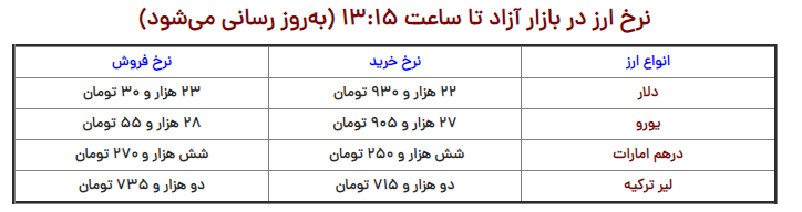 علاوه بر این، نرخ خرید دلار در بازار متشکل ارزی ۲۲ هزار و ۴۰۵ تومان و نرخ فروش آن ۲۲ هزار و ۱۸۳ تومان اعلام شد.