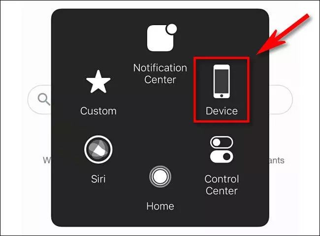 تا زمانی که AssistiveTouch فعال باشد، این دکمه روی صفحه باقی خواهد ماند؛ اما ممکن است گاهی شفاف یا بهطور موقت ناپدید شود. میتوانید با کشیدن انگشت، مکان قرارگیری آن روی نمایشگر را تغییر بدهید. برای قفل کردن آیفون بدون استفاده از کلید پاور، یک بار روی دکمه AssistiveTouch ضربه بزنید. در منوی ظاهرشده روی گزینه دستگاه (Device) ضربه بزنید.