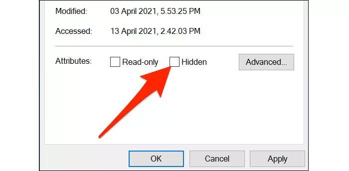 در پنجره Properties باید روی برگه General کلیک کنید و در نهایت، علامت hidden را بردارید.