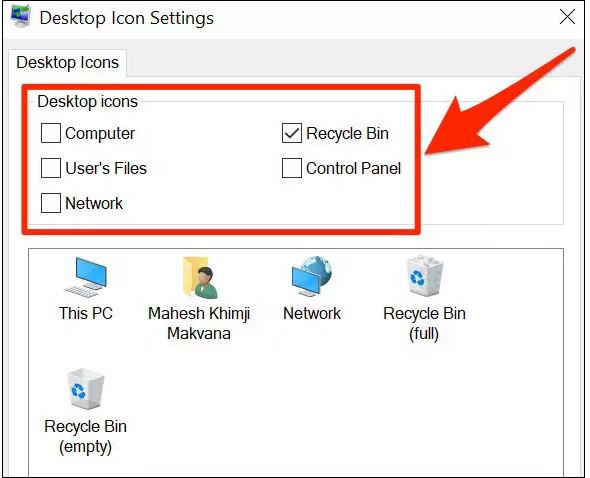قبل از اینکه به آموزش مخفی کردن فایلها و فولدرهای معمولی بپردازیم، بهتر است بدانید که ویندوز ۱۰ مجهز به یک پنل اختصاصی است و به شما اجازه میدهد آیکونهایی همانند سطل زباله، This PC و حتی شبکه (Network) را پنهان کنید. اگر میخواهید یکی از موارد ذکرشده را مخفی یا نمایان کنید، باید وارد تنظیمات (Settings) شوید و از بخش شخصیسازی (Personalization)، تمها (Themes) را انتخاب و در ادامه، گزینه مربوط به تنظیمات آیکون دسکتاپ (Desktop Icon Settings) را انتخاب کنید. پس از انجام مراحل ذکرشده، باید کادرهای موجود در کنار آیکونهای مورد نظر را با کلیک کردن روی آنها، علامت بزنید.