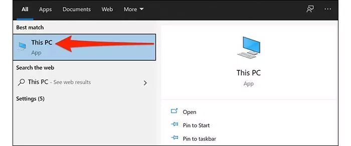 میتوانید از این گزینه برای مخفی کردن فایلهای غیر سیستمی روی دسکتاپ استفاده کنید؛ اما باید از نمایش فایلهای مخفی توسط فایل اکسپلورر هم جلوگیری به عمل آورید. برای انجام این کار، ابتدا کلیدهای ترکیبی Windows + E را فشار بدهید یا منوی استارت را باز و عبارت This PC را تایپ کنید و در ادامه روی گزینه نمایش دادهشده کلیک کنید.