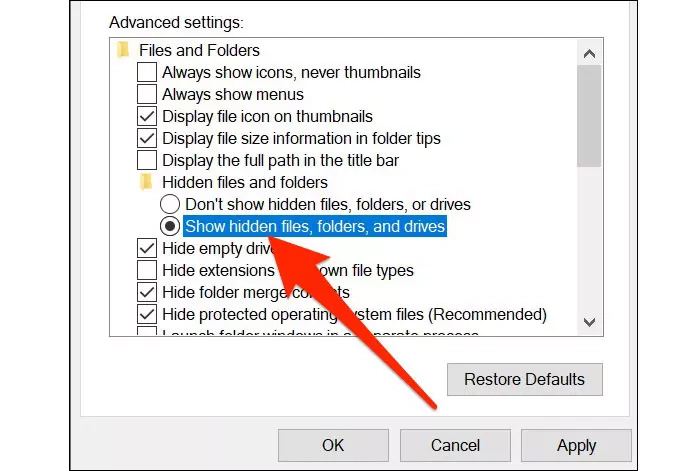 برای انجام این کار باید پنجره File Explorer را باز کنید، سپس View کلیک و گزینه تنظیمات (Options) را در نوار ابزار انتخاب کنید. در پنجره Folder Options، کافی است روی برگه View کلیک کنید. در کادر تنظیمات پیشرفته (Advanced Settings) باید گزینه Show hidden files, folders, and drives را انتخاب کنید.