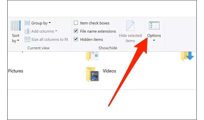 هنگامی که پنجره فایل اکسپلورر باز شد، روی گزینه نمایش (View) کلیک و تنظیمات (Options) را انتخاب کنید.