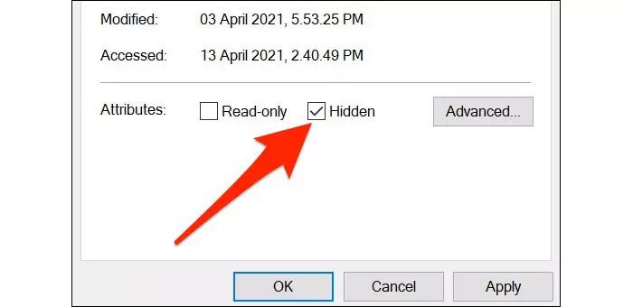 هنگامی که پنجره Properties بازگشایی شد، باید روی برگه General کلیک کنید و سپس قسمت Attributes را در نزدیکی پایین پنجره قرار بدهید. در ادامه کار باید باکس موجود در کنار گزینه Hidden را علامت بزنید.