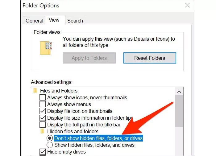 در پنجره Folder Options، روی برگه نمایش (View) کلیک کنید. در ادامه باید کادر تنظیمات پیشرفته (Advanced Settings) را مشاهده و در نهایت، گزینه Don’t Show hidden Files, Folders or Drives را انتخاب کنید.