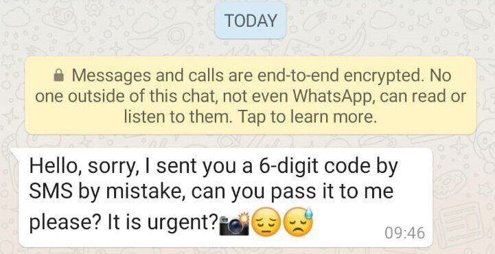 این کلاهبرداری با روشی سادهای انجام میشود به همین دلیل باعث میشود مردم آن را باور کنند. کاربران واتساپ از طریق یک پیام جعلی (تصویر بالا) با کد امنیتی توسط هکرها هدف قرار میگیرند. ممکن است کسی این مورد را به عنوان یک اشتباه صادقانه تلقی کند و جدی بگیرد و کد شش رقمی را برای طرف مقابل ارسال کند، اما کاربر باید دقت و توجه کند که حتی پیام را باز نکند، پاسخ دادن که اصلاً عقلی نیست!