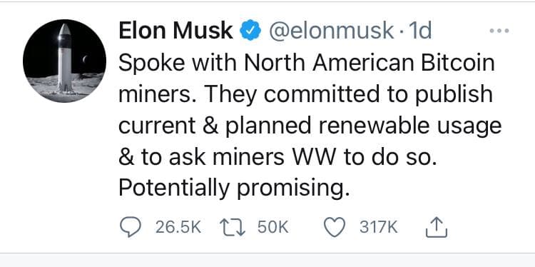ایلان ماسک در توئیتر خود نوشت گفتگوهای فعالی با ماینرهای بیت‌کوین در مورد پایداری و بقای ارزهای دیجیتال داشته است. آنها متعهد شدند میزان فعلی استفاده از انرژی‌های تجدیدپذیر و میزان برنامه‌ریزی شده استفاده از آنها در آینده را منتشر کنند. این اتفاقی امید بخش است.