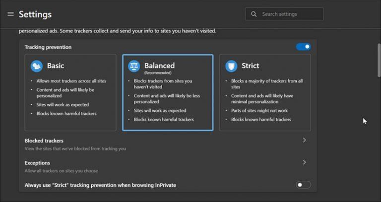 در فایرفاکس و مایکروسافت اج از سه حالت برای جلوگیری از ردیابی میتوانید بهره ببرید که هرکدام از این حالتها مزایای و معایب خود را دارند. برای حالت ناشناس مایکروسافت اج توصیه میکنیم گزینهی Always use Strict tracking prevention when browsing InPrivate را برای بهبود حریم خصوصی فعال کنید.