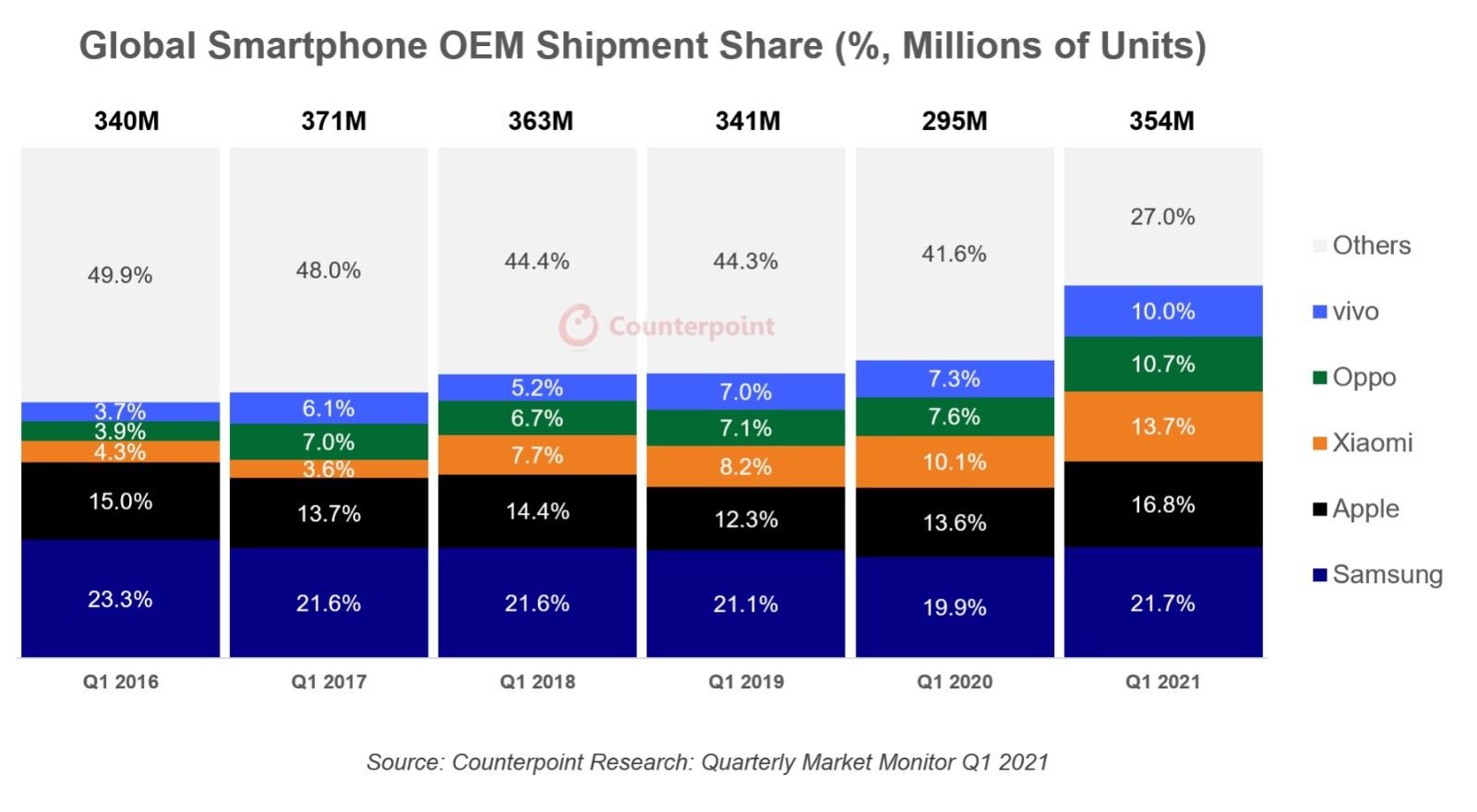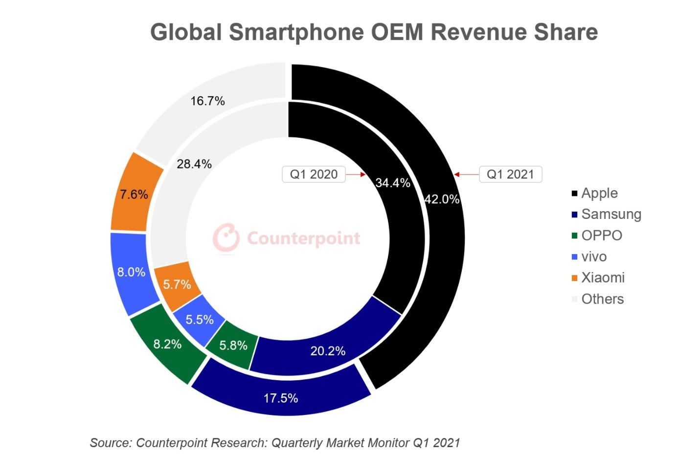 سامسونگ، اپل، اوپو، ویوو و شیائومی بزرگترین تولیدکنندگان گوشیهای موبایل هوشمند محسوب میشوند و طبیعتا بیشترین درآمد بازار موبایل را کسب میکنند. اپل با ۴۲ درصد و سامسونگ با ۱۷.۵ درصد بیشترین سهم بازار موبایل را به خود اختصاص دادهاند.