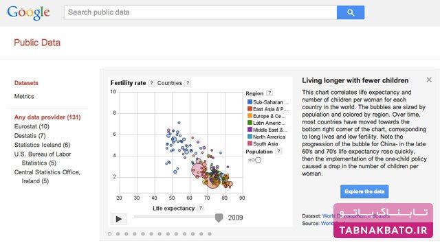 این سرویس به شما امکان می دهد تا در پایگاه های اطلاعاتی از سراسر جهان از جمله بانک جهانی، سازمان همکاری اقتصادی و توسعه، اداره آمار جوامع اروپا و دفتر سرشماری ایالات متحده جستجو کنید. بعد از اینکه خواسته خود را پیدا کردید، میان دسته ها فیلتر کنید تا نمودارهایی با مضامین مورد نظر خود ایجاد کنید.