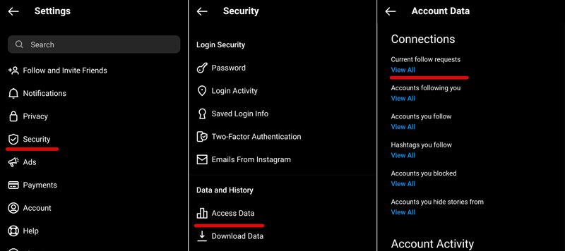 برای دیدن این افراد، از اپلیکیشن اینستاگرام، وارد Setting شوید، به بخش Security وارد شوید و از قسمت Data and History از پایین صفحه، گزینه Access Data را انتخاب کنید. در این بخش به اطلاعات بسیار زیادی میتوانید دست پیدا کنید.