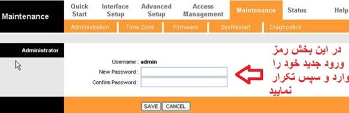 ۲- روی گزینه Maintenance > Administration کلیک کنید و سپس گذارواژه جدید خود را وارد کنید و سپس کلمه Save را انتخاب نمایید.