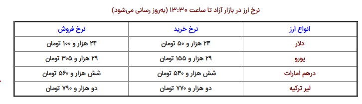 قیمت یورو در بازار آزاد نیز با افزایش ۵۰۵ تومانی به ۲۹ هزار و ۳۷۵ تومان رسید. صرافیها دلار و یورو را به ترتیب ۲۴ هزار و ۵۰ تومان و ۲۹ هزار و ۲۲۵ تومان خریداری کردند. همچنین نرخ فروش درهم امارات شش هزار و ۵۷۵ تومان و لیر ترکیه دو هزار و ۷۸۵ تومان قیمت خورد.