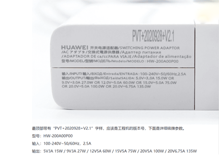 بلافاصله پس از انتشار این خبر، یک وبلاگ نویس شبکه اجتماعی Weibo ثابت کرده است که هواوی یک شارژر پرقدرت 135 وات را راه اندازی میکند که از رابط اصلی USB-C استفاده میکند و از شارژ فوق العاده سریع لپ تاپها و تلفنهای هوشمند هواوی پشتیبانی میکند. از روی شناسه روی بدنه دستگاه میتوان فهمید که این مدل شارژر HW-200A00P00 نام دارد که از 20 ولت یا 6.75 آمپر شارژ سریع پشتیبانی میکند که مخصوص نوت بوکها ساخته شده هواوی است. با این حال، با چندین پروتکل مانند PD، DCP، QC2.0، QC4، FCP، SCP و سایر موارد سازگار است که میتواند آن را با اکثر محصولات دیجیتال موجود در بازار سازگار سازد.