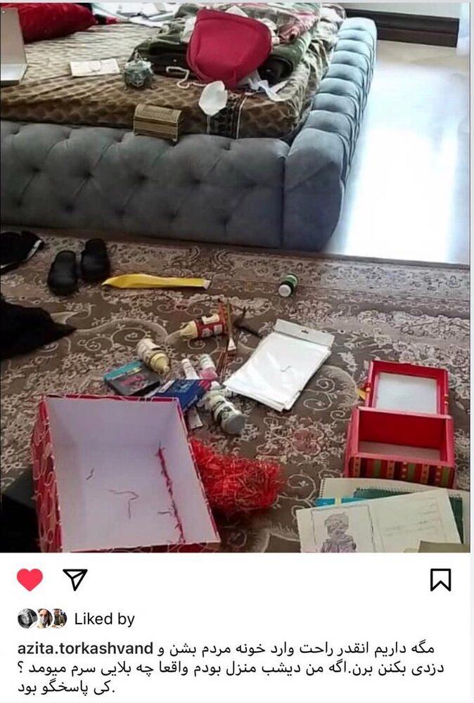 آزیتا ترکاشوند، بازیگر سینما و تلویزیون، که در سریال هیولا ساخته مهران مدیری حضور داشته است به تازگی در پستی اینستاگرامی گفته است که از خانه او دزدی شده است و سارقان گاوصندوق او را ربوده اند.