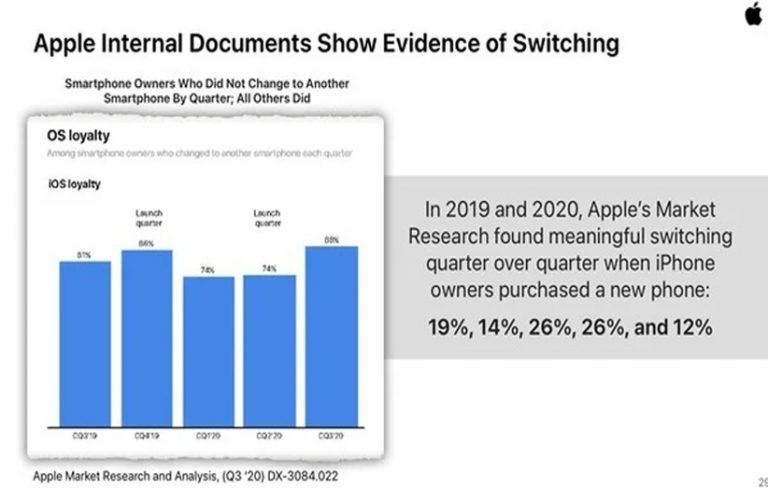 اما خب این موضوع سبب شد کاربران به این نکته نیز فکر کنند که اگر اپل بخواهد با تمام شرکتها به خاطر همین سیاست چنین مشکلی را بوجود بیاورد، بهتر است به رقبای اندرویدی کوچ کنند. اینطور شد که شرکت در جریان دادگاه با اپیک گیمز، اطلاعاتی را منتشر کرد مبنی براینکه در بازهی زمانی سهماه سوم ۲۰۱۹ تا سهماه سوم ۲۰۲۰، چیزی بین ۱۲ تا ۲۶ درصد از کاربران خود را از دست داد. در واقع این کاربران به استفاده از گوشیهای دیگر روی آوردند که خب اپل اسمی از آنها نبرده اما همهی ما میدانیم منظور همان اندروید است.