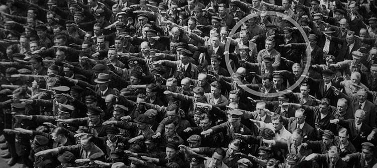 آگوست لندمسر، تنها آلمانی که حاضر به بلند کردن بازوی راست خود در میان اطرافیان هیتلر در جلسه ۱۹۳۶ نشد.