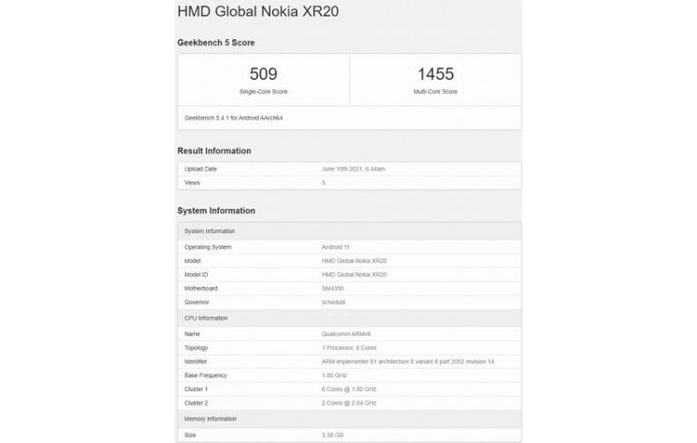 همانطور که مشاهده میکنید، لیست گیکبنچ نشان میدهد اقتصادی بعدی نوکیا محصولی با پشتیبانی از اینترنت ۵G خواهد بود و از ۴ گیگابایت حافظهی رم و پردازندهی نسبتا خوب اسنپدراگون ۴۸۰ ۵G بهعنوان قلب تپندهی خود بهره میبرد. در این پردازنده ۸ هسته وجود دارد که به دو دستهی ۲ و ۶ تایی تقسیم میشوند. دو هستهی اول از نوع Cortex-A76 با فرکانس ۲٫۰۴ گیگاهرتز و شش هستهی دیگر هم از نوع Cortex-A55 و با فرکانس ۱٫۸ گیگاهرتز. همچنین آدرنو ۶۱۹ بهعنوان پردازشگر گرافیکی این پردازنده را همراهی میکند. بنابراین به نظر میرسد نوکیا XR20 با وجود اینکه یک اقتصادی خطاب میشود، توانایی پردازشی و گرافیکی خوبی دارد.