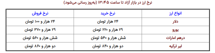 یورو هم ۲۸۰ تومان گران شد و ۲۹ هزار و ۲۸۵ تومان قیمت خورد. نرخ خرید دلار و یورو در بازار آزاد، به‌ترتیب ۲۳ هزار و ۹۳۰ تومان و ۲۹ هزار و ۱۳۵ تومان خواهد بود. همچنین درهم امارات شش هزار و ۵۴۰ تومان و لیر ترکیه دو هزار و ۸۵۰ تومان قیمت‌گذاری شدند.