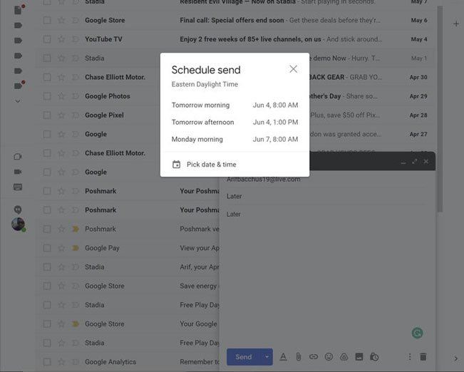 گاهی اوقات به هر دلیلی باید زمان ارسال ایمیلها را از قبل تعیین کنید و برای این کار باید از قابلیت Schedule Send جیمیل استفاده کنید. برای این کار، ابتدا ایمیل خود را آماده کنید و سپس بر روی فلش موجود در سمت راست دکمهی Send کلیک کنید تا گزینهی Schedule Send پدیدار شود. با این کار، به راحتی قادر به تعیین زمان موردنظر برای ارسال ایمیل خواهید بود.
