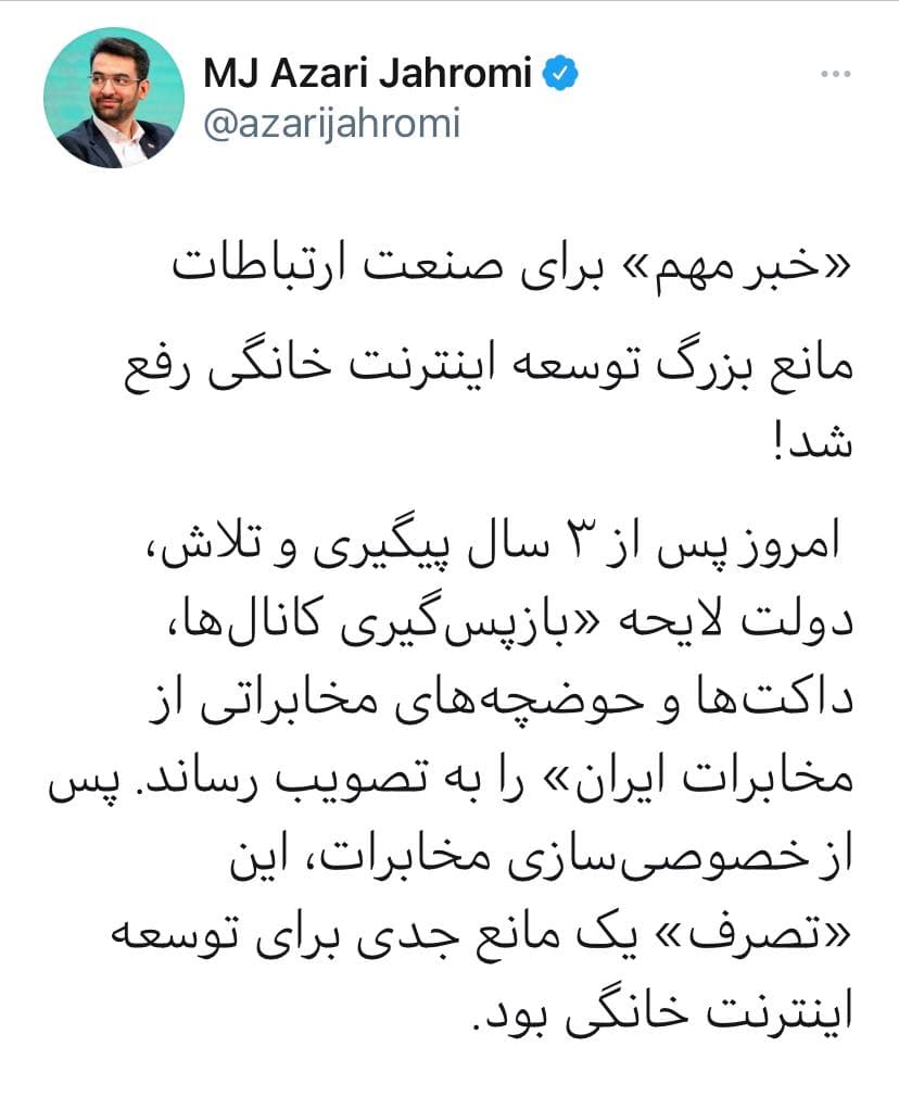وزیر ارتباطات و فناوری اطلاعات از رفع شدن مانع بزرگ توسعه اینترنت خانگی خبر داد.