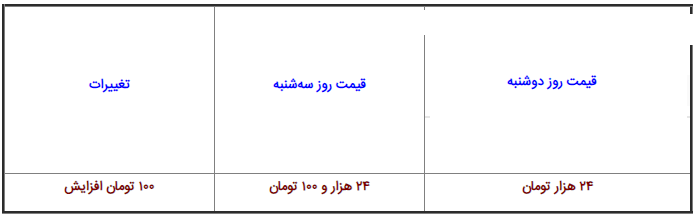 | ۲۴ هزار تومان | ۲۳ هزار و ۹۵۰ تومان | ۲۴ هزار و ۱۱۰ تومان | ۱۶۰ تومان |