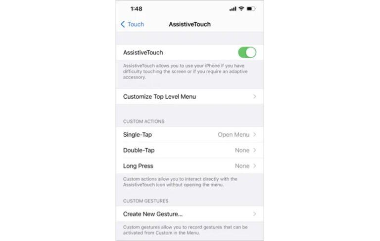 در سیستمعامل iOS این امکان وجود دارد که کاربران، ژستهای مورد نظر خود را شخصیسازی کنند. امکان انجام این کار در بخش AssistiveTouch در تمامی گوشیهای آیفون که به iOS 10 یا بالاتر مجهز شدهاند در دسترس قرار دارد. تنها کافی است وارد تنظیمات شده و در بخش Accessibility، سپس Touch و در نهایت AssistiveTouch، این گزینه را فعال کنید. میبینید که منوی شناور روی صفحه نمایش ظاهر میشود.